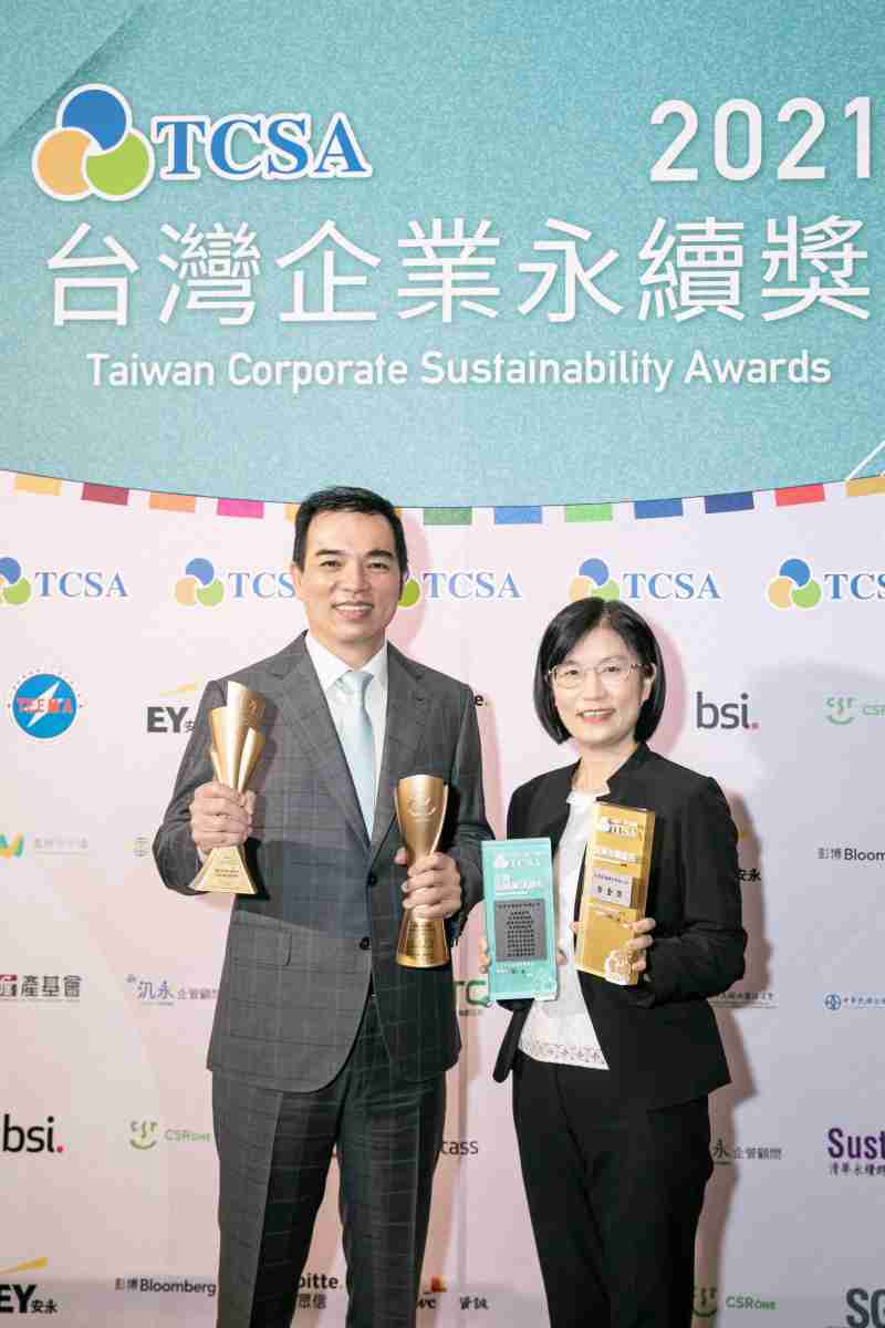 达在台湾永续奖所评比环境、、、社会、、、治理等各面向的永续绩效均获高度肯定 (左:彩霸王光电总经理暨营运长柯富仁,,,,右:彩霸王光电永续长古秀华)