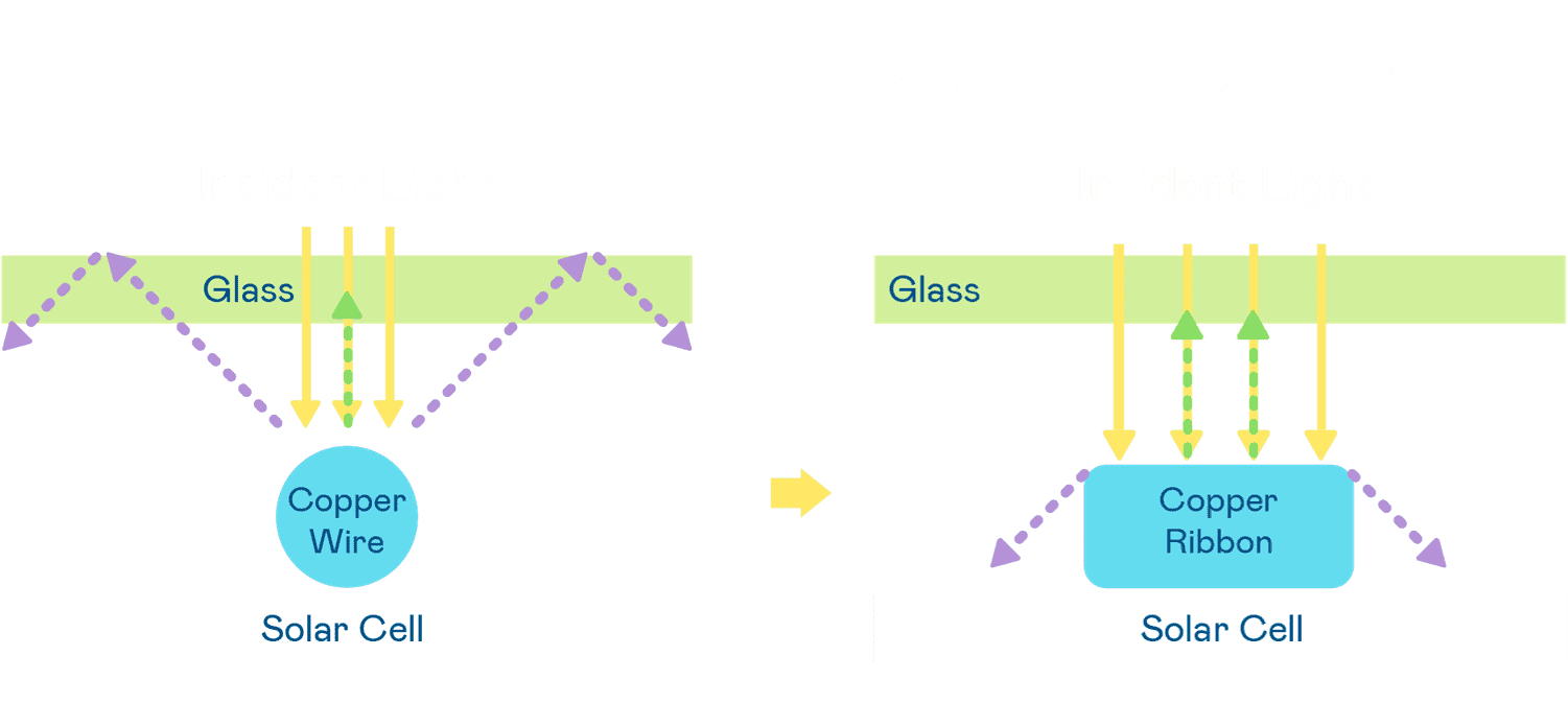 • 电池使用多条铜导线 (Copper wire) 于电池片上形成较短的电流路径,,,提高电流收集效率,,采用圆形设计的铜导线较传统扁平式的铜焊带 (Ribbon),,,,可增加入射至电池的光线量。。。。