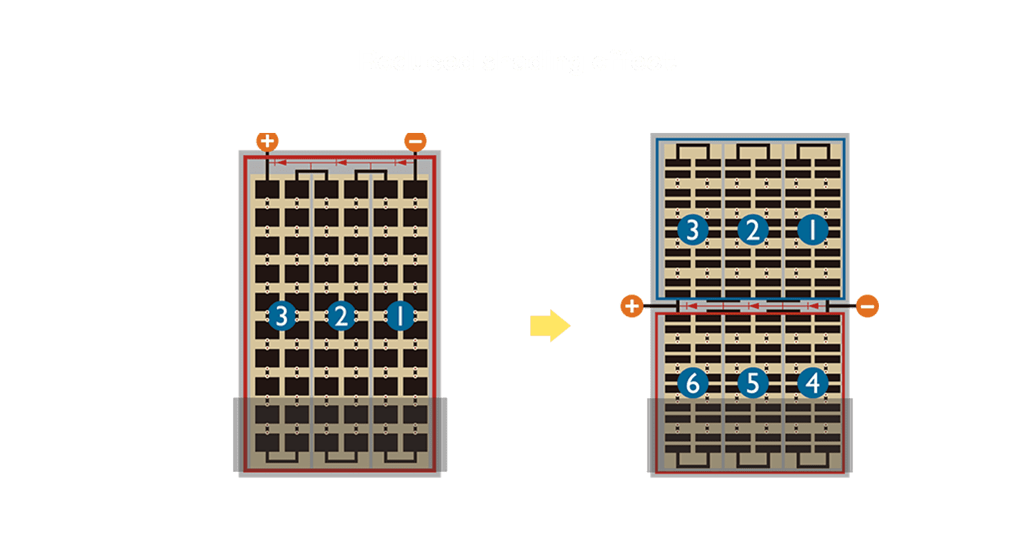 • 结合半切电池,,,,降低遮阴影响、、提升模组抗隐裂能力、、、并减少电阻损耗,,进一步提升模组发电效能。。。